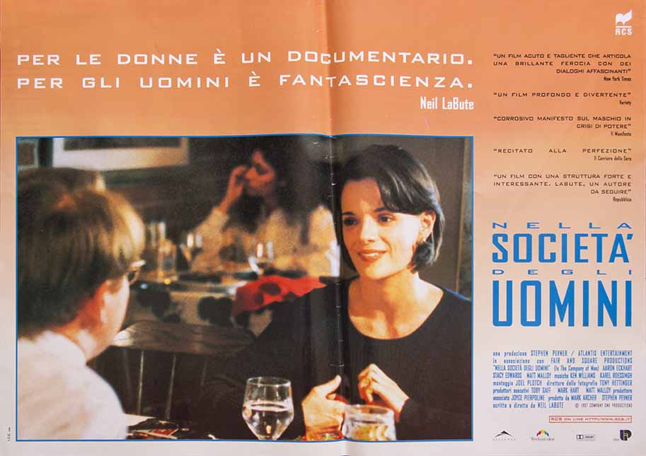 Nella società degli uomini è un film del 1997, esordio alla regia del regista e drammaturgo Neil LaBute. Il film è tratto da un’omonima opera teatrale di LaBute stesso, scritta nel 1993, che traccia una cruda analisi del machismo e la misoginia di alcuni yuppie, nel pieno boom economico.