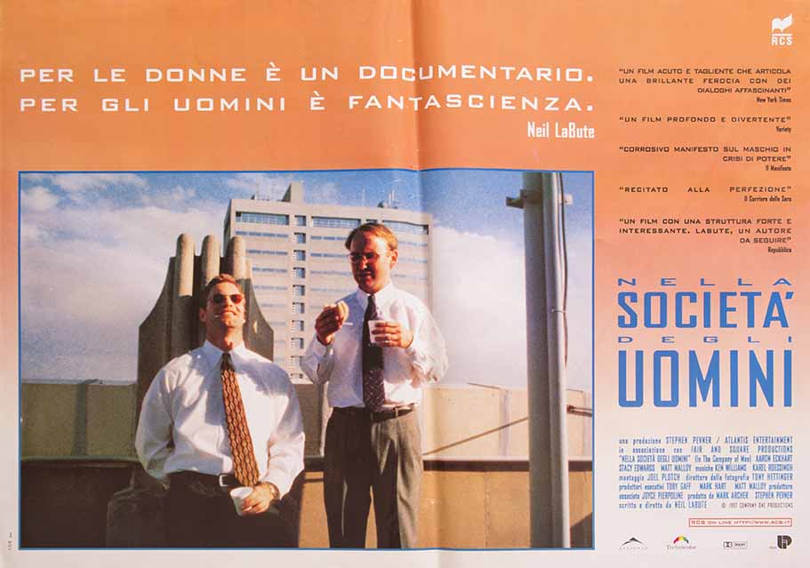 Nella società degli uomini è un film del 1997, esordio alla regia del regista e drammaturgo Neil LaBute. Il film è tratto da un’omonima opera teatrale di LaBute stesso, scritta nel 1993, che traccia una cruda analisi del machismo e la misoginia di alcuni yuppie, nel pieno boom economico.